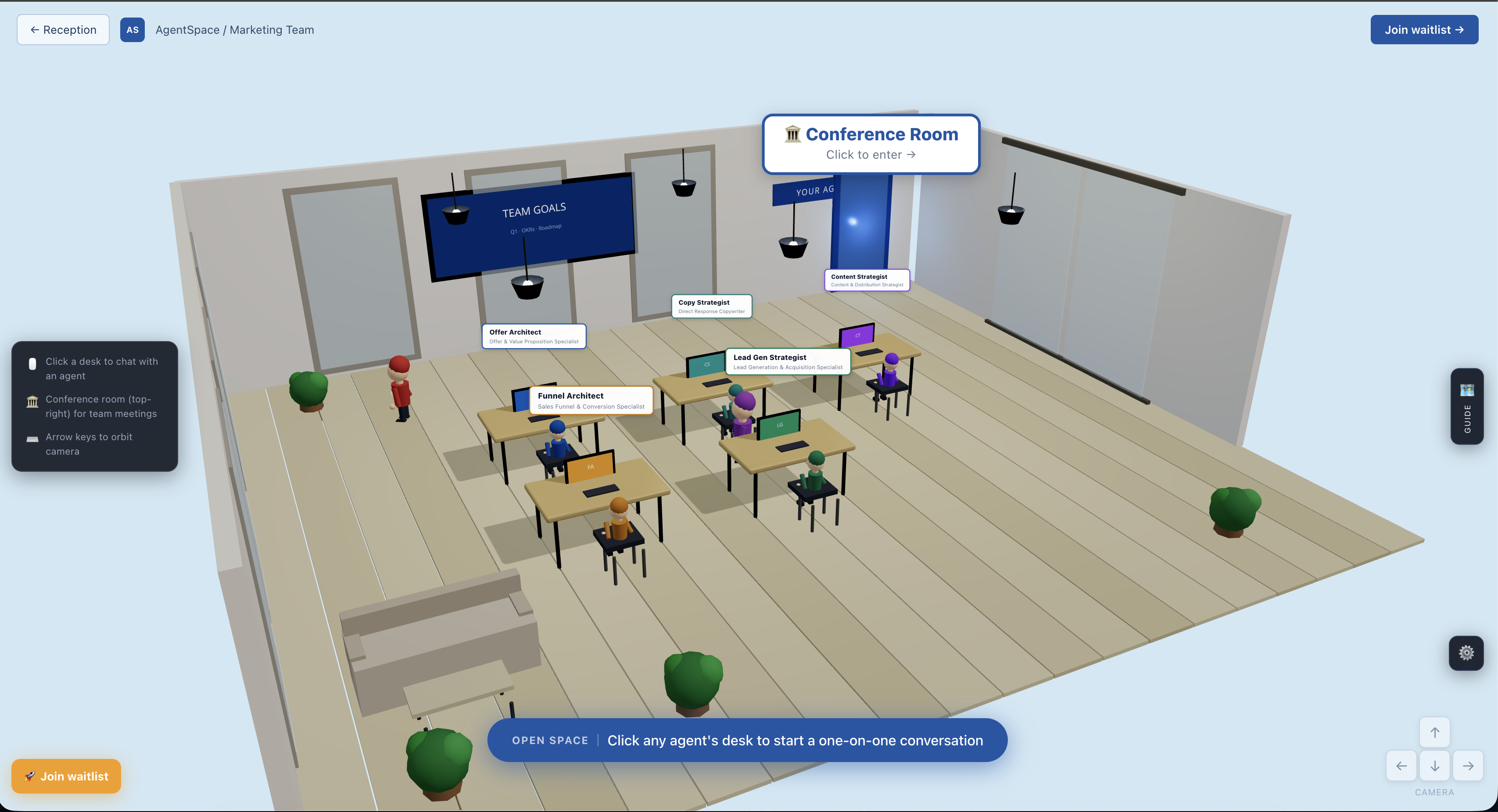 Your AI agents have faces, desks and meetings โ not just a chat window. Built for agencies and service businesses who want AI that clients can actually see โ not just use.